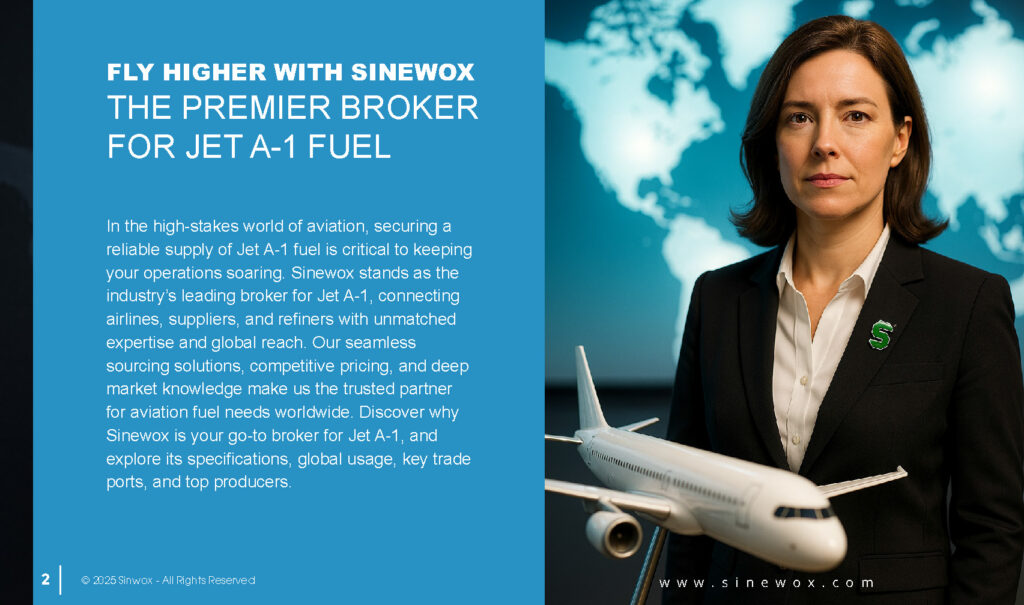 In the high-stakes world of aviation, securing a reliable supply of Jet A-1 fuel is critical to keeping your operations soaring. Sinewox stands as the industry’s leading broker for Jet A-1, connecting airlines, suppliers, and refiners with unmatched expertise and global reach. Our seamless sourcing solutions, competitive pricing, and deep market knowledge make us the trusted partner for aviation fuel needs worldwide. Discover why Sinewox is your go-to broker for Jet A-1, and explore its specifications, global usage, key trade ports, and top producers.