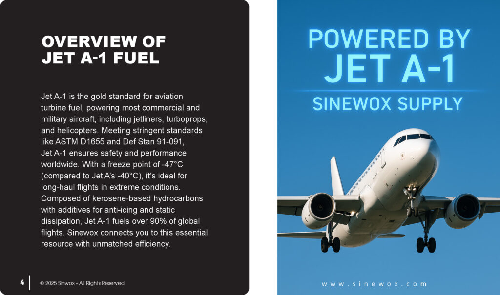 Jet A-1 is the gold standard for aviation turbine fuel, powering most commercial and military aircraft, including jetliners, turboprops, and helicopters. Meeting stringent standards like ASTM D1655 and Def Stan 91-091, Jet A-1 ensures safety and performance worldwide. With a freeze point of -47°C (compared to Jet A’s -40°C), it’s ideal for long-haul flights in extreme conditions. Composed of kerosene-based hydrocarbons with additives for anti-icing and static dissipation, Jet A-1 fuels over 90% of global flights. Sinewox connects you to this essential resource with unmatched efficiency.