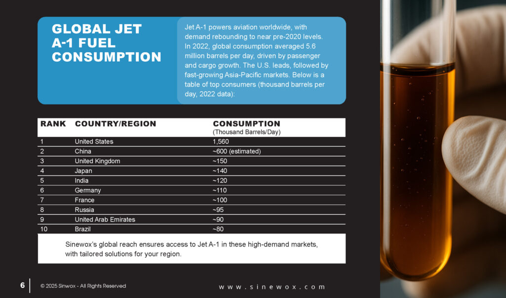 Jet A-1 powers aviation worldwide, with demand rebounding to near pre-2020 levels. In 2022, global consumption averaged 5.6 million barrels per day, driven by passenger and cargo growth. The U.S. leads, followed by fast-growing Asia-Pacific markets. Below is a table of top consumers (thousand barrels per day, 2022 data):