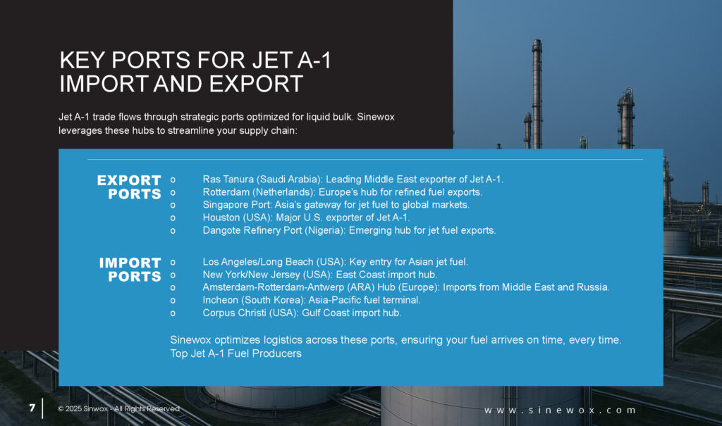 Jet A-1 trade flows through strategic ports optimized for liquid bulk. Sinewox leverages these hubs to streamline your supply chain: