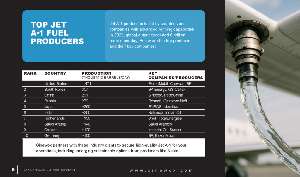 Jet A-1 production is led by countries and companies with advanced refining capabilities. In 2022, global output exceeded 6 million barrels per day. Below are the top producers and their key companies: